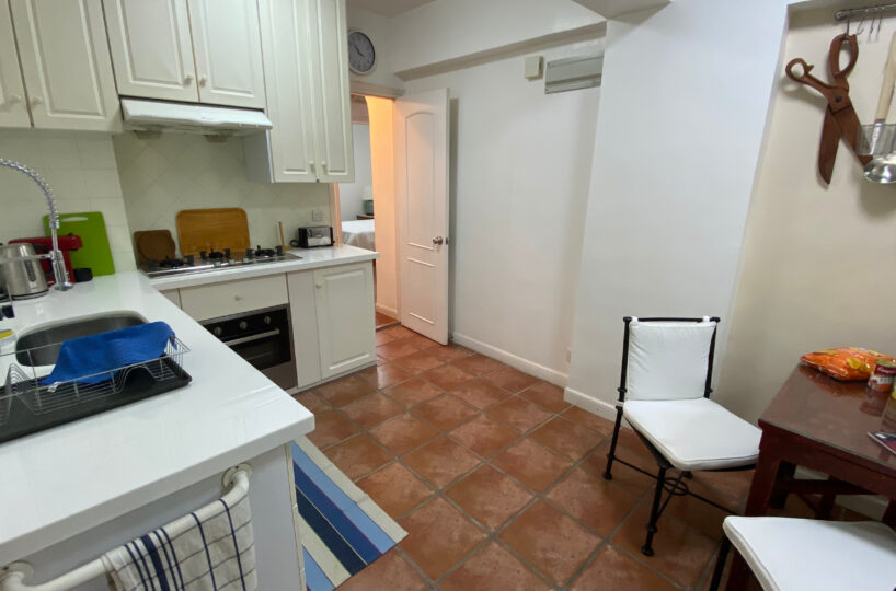 - Fully equipped Western-style kitchen with red ceramic flooring.